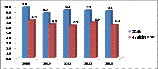從更長的時間來看,2009年以來,石油加工行業(yè)的物流成本水平總體上呈現(xiàn)下降趨勢,相對于2009年的7.3%,2013年物流費用率下降了0.9個百分點。