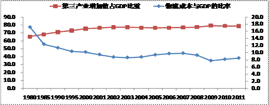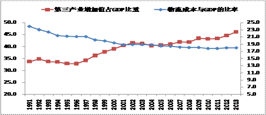 根據美國的歷史數據進行分析表明,在美國,第三產業增加值占GDP的比重每上升1個百分點,物流成本與GDP的比率下降約0.6個百分點。