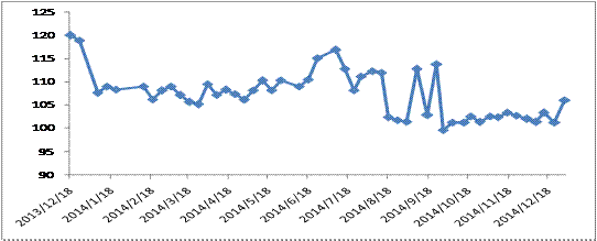 從公路貨運(yùn)市場(chǎng)來(lái)看,受公路貨運(yùn)周轉(zhuǎn)量增速回落影響,2014年,公路貨運(yùn)價(jià)格指數(shù)呈現(xiàn)前高后低、總體趨降的基本走勢(shì)。2014年最后一周,林安道路運(yùn)價(jià)總指數(shù)為106.13,較2013年年末最后一周下降約10個(gè)百分點(diǎn)左右,較2014年年初第一周下降1.6個(gè)百分點(diǎn)。