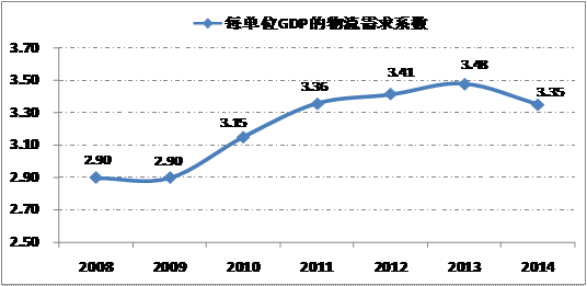 二是單位GDP的物流需求系數(shù)自2008年以來(lái)首次下降。2008年以來(lái),我國(guó)單位GDP的物流需求系數(shù)整體上不斷上升,2013年達(dá)到3.48的較高水平。2014年,單位GDP的物流需求系數(shù)為3.35,近年來(lái)首次出現(xiàn)下降,顯示出創(chuàng)造單位GDP所需的物流規(guī)模所有下降,單位GDP的物流需求系數(shù)有望進(jìn)入回落區(qū)間。由此表明,我國(guó)經(jīng)濟(jì)運(yùn)行進(jìn)入新階段,傳統(tǒng)的依靠“高物耗、高物流”的增長(zhǎng)模式正在發(fā)生積極轉(zhuǎn)變,經(jīng)濟(jì)結(jié)構(gòu)調(diào)整的效應(yīng)逐步顯現(xiàn)。