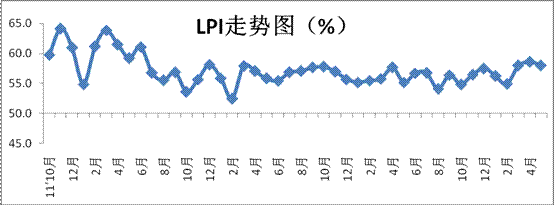 中國物流與采購聯合會發布的2015年5月份中國物流業景氣指數(LPI)為58%,比上月回落0.6個百分點。各分項指數中,除固定資產投資完成額指數回升外,其他分項指數均有不同程度的回落。