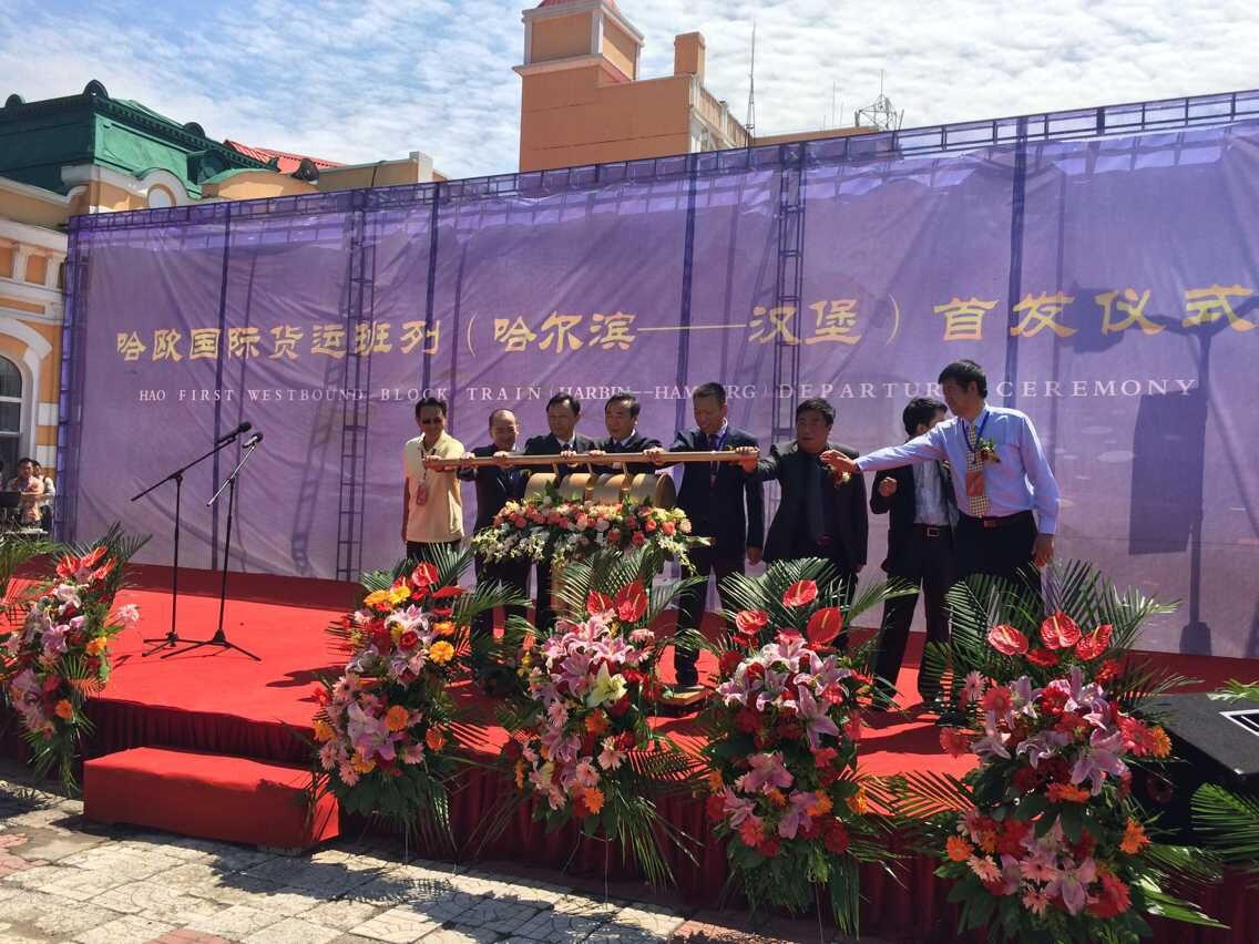 6月13日,中國物流與采購聯合會會長何黎明在哈爾濱香坊火車站出席了哈歐國際貨運班列開通儀式并發表熱情洋溢的致辭,同時與黑龍江省政府常務副省長郝會龍、黑龍江省委秘書長李海濤以及長久物流董事長薄世久等共同為首趟班列推動啟動桿。