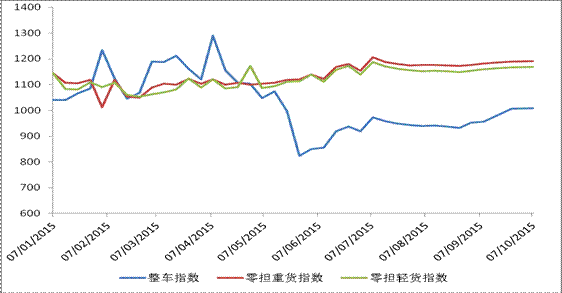 分車型指數(shù)環(huán)比均有小幅回升,但回升幅度有所收窄,整車指數(shù)環(huán)比漲幅略高于零擔指數(shù)。本周,整車指數(shù)為1008.9點,比上周回升0.16%,幅度較9月底收窄2.9個百分點,比年初回落1.6%;零擔輕貨指數(shù)為1168.6點,比上周回升0.1%,比年初回升5.6%;零擔重貨指數(shù)為1191.4點,比上周回升0.1%,比年初回升7.3%。