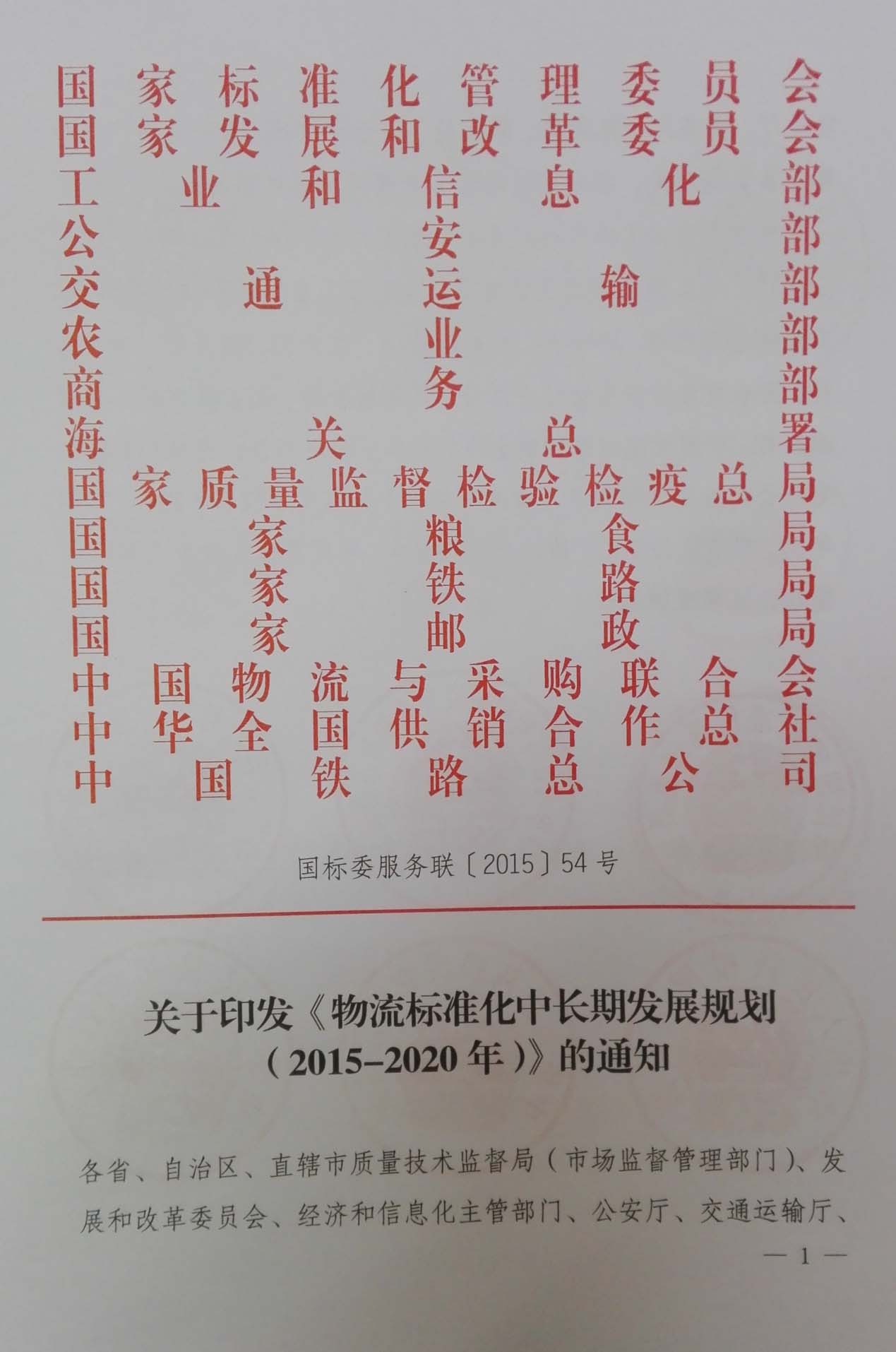 為貫徹落實《物流業發展中長期規劃(2014-2020年)》(國發[2014]42號),國家標準化管理委員會聯合國家發展和改革委員會、工業和信息化部、公安部、交通運輸部、農業部、商務部、海關總署、國家質量監督檢驗檢疫總局、國家糧食局、國家鐵路局、國家郵政局、中國物流與采購聯合會、中華全國供銷合作總社、中國鐵路總公司等單位編制了《物流標準化中長期發展規劃(2015-2020年)》。