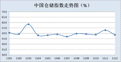 中國物流與采購聯(lián)合會與中儲發(fā)展股份有限公司聯(lián)合調(diào)查的2015年12月中國倉儲指數(shù)為48.7%,較上月大幅回落4.4個百分點。各分項指數(shù)中,除期末庫存指數(shù)出現(xiàn)回升外,其余指數(shù)均有不同程度回落。