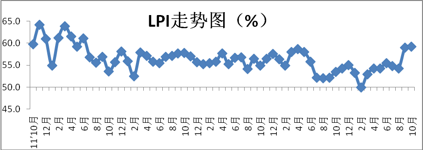 固定資產投資完成額指數回升,物流基礎設施趨于改善。10月份,固定資產投資完成額指數為52.6%,回升2.3個百分點,反映出物流運行的基礎設施條件有所改善。