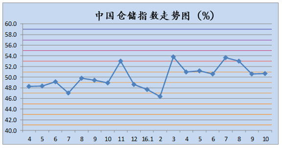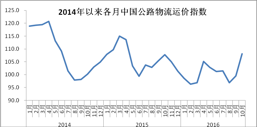 中國物流與采購聯合會發布的2016年10月份中國物流業景氣指數為59.2%較上月回升0.2個百分點;中國倉儲指數為50.7%,較上月回升0.1個百分點;中國公路物流運價指數為108.1點,比上月回升8.7%。