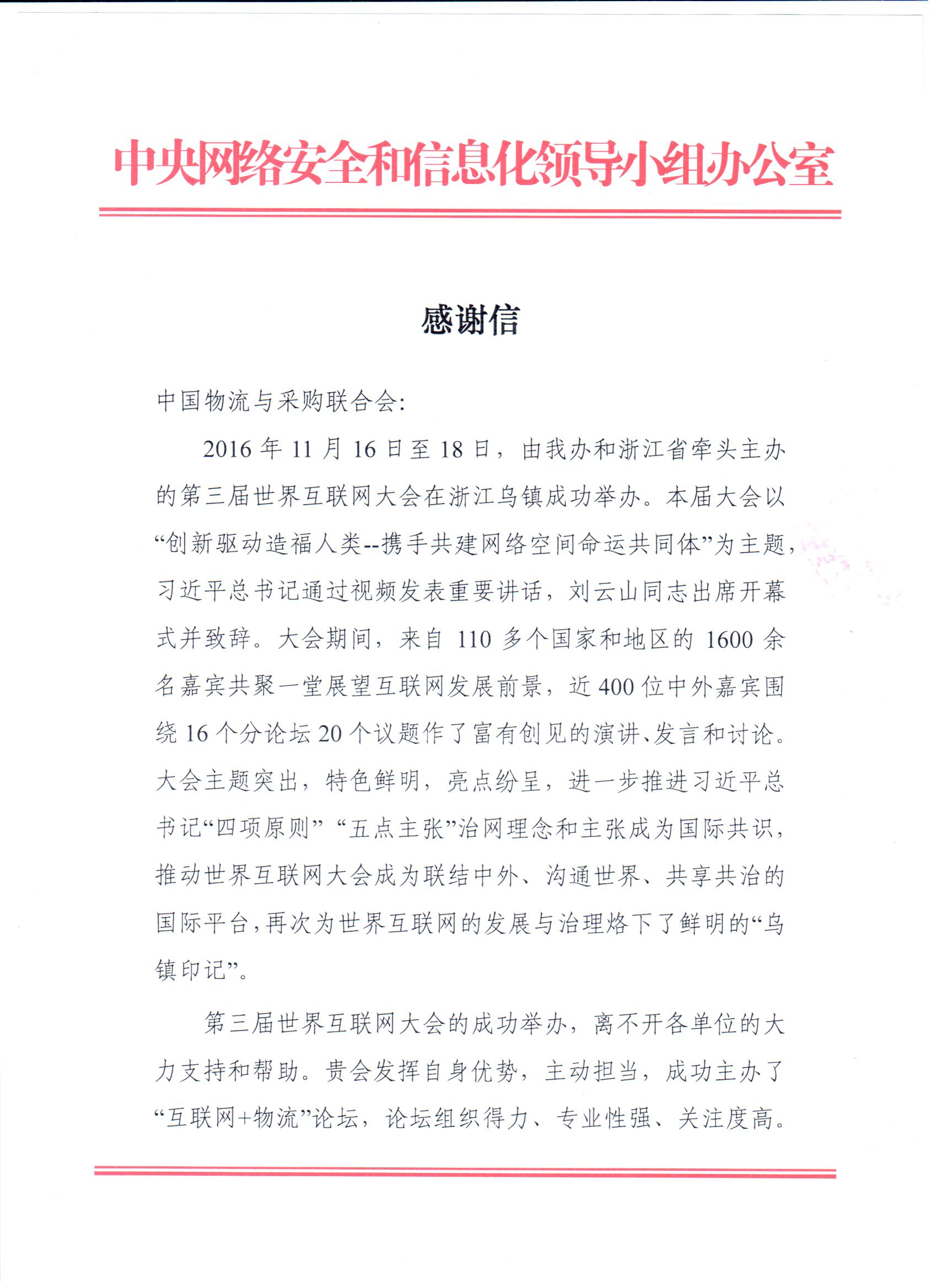 2016年11月16日至18日,第三屆世界互聯網大會在浙江烏鎮召開。來自110多個國家的1600余名嘉賓共聚一堂展望互聯網發展前景。其中由中國物流與采購聯合會主辦的“互聯網+物流”論壇,是本屆大會中唯一個由社會團體獨立主辦的論壇。論壇以“互聯網+物流創新與實踐--實現經濟發展轉型升級”為主題,何黎明會長、蔡進副會長、菜鳥網絡童文紅等30余位嘉賓和150名代表出席了會議,取得較好的效果。整個論壇的籌備、策劃、實施和總結等工作歷時三個月,表現出了高度的專業性和組織協調能力,受到了中央網信辦的表彰。