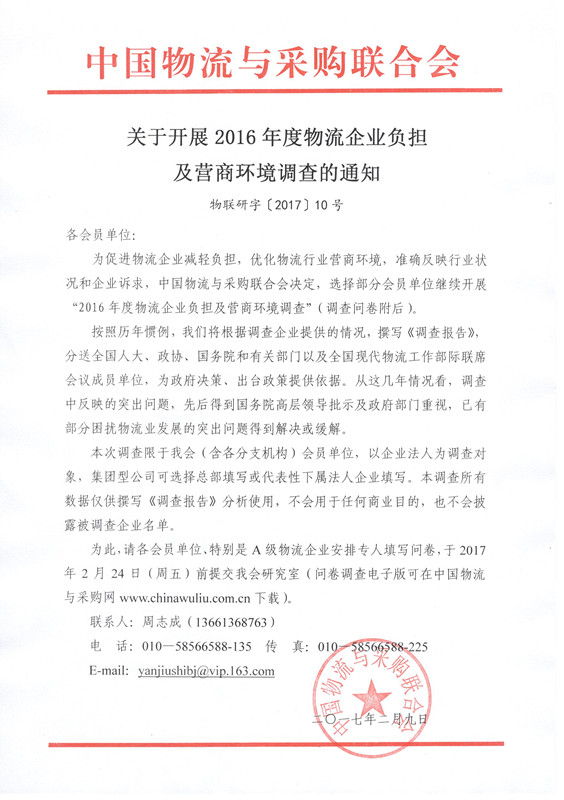 關于開展2016年度物流企業負擔及營商環境調查的通知(597.92 KB)