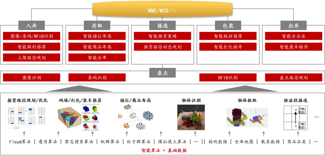(1)倉儲。基于倉庫、商品、訂單、波次等基礎(chǔ)數(shù)據(jù),未來將會實現(xiàn)入庫、存取、揀選、包裝、出庫和盤點環(huán)節(jié)中各項作業(yè)的智能調(diào)度。