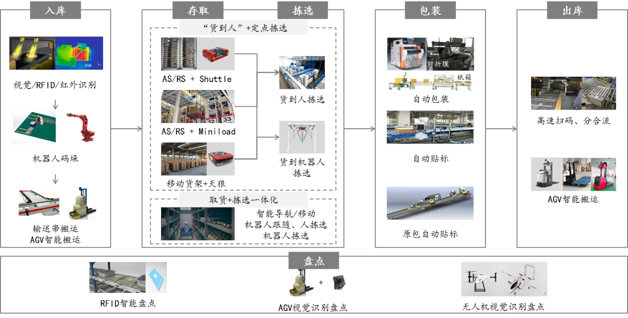 ·智能設(shè)備:通過自主控制技術(shù),進行智能抓取、碼放、搬運及自主導航等,使整個物流作業(yè)系統(tǒng)具有高度的柔性和擴展性,例如揀選機器人、碼垛機器人、AGV、無人機、無人車等;