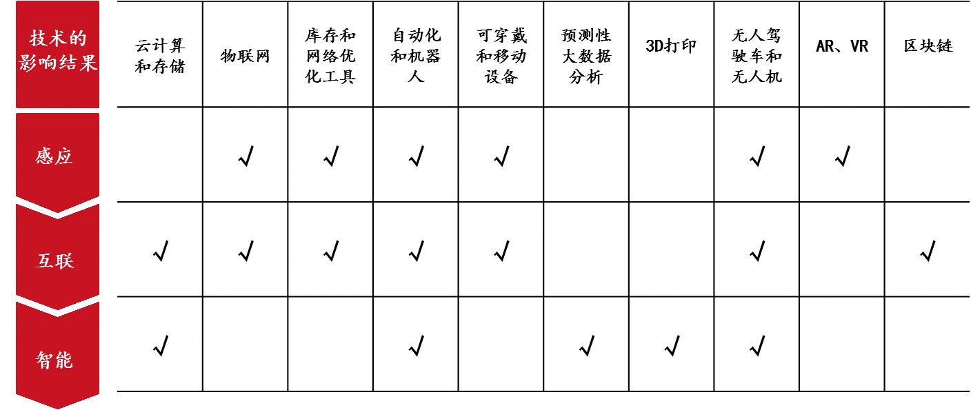 這些新技術(shù)驅(qū)動物流變化的結(jié)果,主要體現(xiàn)在三個方面:一是感應,使物流整個場景數(shù)字化;二是互聯(lián),使整個供應鏈內(nèi)的所有元素相互連接;三是智能,供應鏈相關(guān)的決策將更加自主、智能。