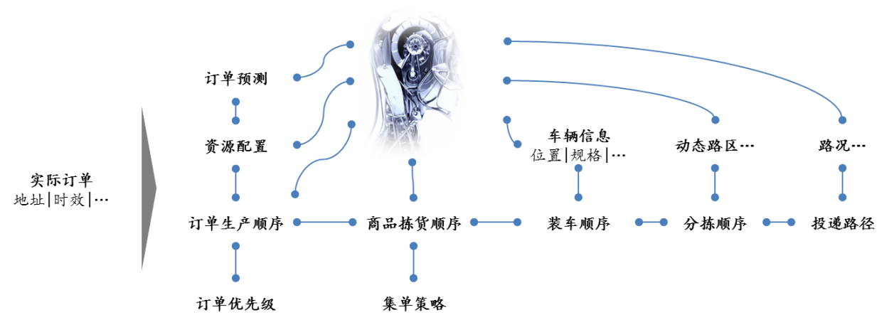 以訂單生產(chǎn)及裝車順序智能編排為例:基于實時定位的應用,根據(jù)車輛信息(包括預計到達倉庫/分揀中心的時間、車輛規(guī)格等),以及實際訂單的地址及投遞時效信息,智能設(shè)置動態(tài)的截單時間,按照波次編排訂單生產(chǎn)順序和集單揀貨順序,并按包裹投遞順序倒排裝車順序。