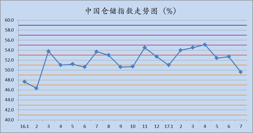 中國物流與采購聯合會與中儲發展股份有限公司聯合調查的2017年7月中國倉儲指數為49.6%,較上月回落3.1個百分點。各分項指數中,延伸業務量指數、設施利用率指數、業務活動預期指數較上月有所回升,其余指數均有不同程度的回落。