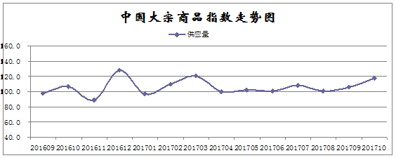 10月份,大宗商品供應(yīng)指數(shù)為117.8%,升幅較上月擴(kuò)大11.8個(gè)百分點(diǎn),連續(xù)兩個(gè)月升幅擴(kuò)大,且幅度明顯加大。從數(shù)據(jù)的變化情況來看,雖然隨著北方地區(qū)采暖季限產(chǎn)政策的逐漸深入,影響了部分商品的生產(chǎn),但由于近期價(jià)格持續(xù)高漲,企業(yè)生產(chǎn)利潤(rùn)仍然可觀,廠家開工率仍舊維持高位,特別是未限產(chǎn)地區(qū)鋼廠正抓住年前最后的時(shí)間全力生產(chǎn),努力保障效益實(shí)現(xiàn)及市場(chǎng)供給。各主要商品中,除鋼鐵、化工供應(yīng)有所減少外,其余品種均呈現(xiàn)不同程度的增加,特別是能源類商品供應(yīng)增長(zhǎng)明顯。