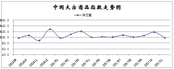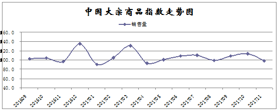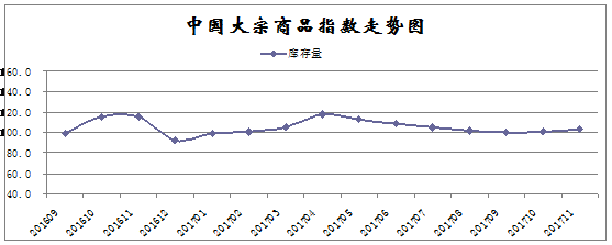 由中國物流與采購聯合會調查、發布的2017年11月份中國大宗商品指數為99.4%,創下近十個月以來的最低。各分項指數中,供應指數、銷售指數均自高位回落,庫存指數升幅繼續擴大。數據表明國內大宗商品市場供銷雙側均顯弱勢,商品庫存持續積壓,市場存在一定的下行壓力,特別是在北方氣溫下降、采暖季工地停工增加,以及年末資金緊張因素影響下,預計后期國內大宗商品市場需求將會進一步趨弱。