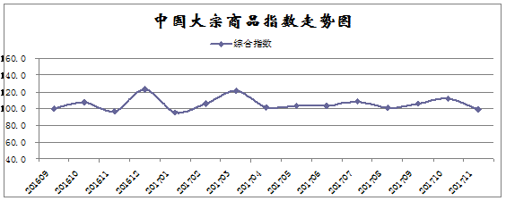 由中國物流與采購聯合會調查、發布的2017年11月份中國大宗商品指數為99.4%,時隔九個月后再度出現回落局面。各分項指數中,供應指數、銷售指數均自高位回落,庫存指數繼續上升,且升幅繼續擴大,商品價格整體仍處在上升通道。從本月指數的變化情況來看,隨著天氣轉冷以及環保限產全面推進,給供需兩側均帶來影響,市場供大于求的跡象顯現,商品庫存出現積壓,價格的持續上漲也進一步加劇了終端企業的經營壓力,后期市場存在一定的下行壓力。