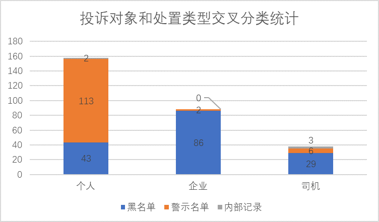 結(jié)合投訴對象與處置類型兩個(gè)維度,可知個(gè)人失信名單中,警示名單所占比例最大,而企業(yè)和司機(jī)失信名單中,黑名單所占比例最大。