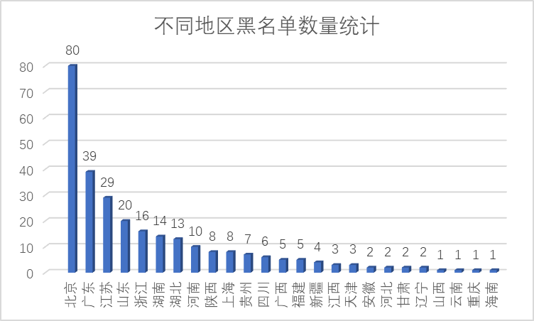受誠信聯(lián)盟企業(yè)業(yè)務(wù)范圍影響,目前業(yè)務(wù)覆蓋區(qū)域來看,北京地區(qū)黑名單總數(shù)最多,所占比重最大,高達(dá)80條。黑名單記錄數(shù)大于10條省份有廣東、江蘇等7個(gè),其余16省份失信記錄數(shù)均不足10條。由于無法統(tǒng)計(jì)地區(qū)交易記錄總數(shù),因此無法判定各地誠信水平,此統(tǒng)計(jì)表僅反映本次上報(bào)黑名單現(xiàn)狀,不做橫向比較。