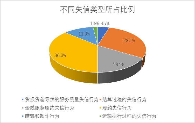 根據(jù)黑名單標(biāo)準(zhǔn)規(guī)定的六項(xiàng)失信行為,數(shù)量最多的為履約失信行為,占總記錄數(shù)的36.3%,其次是結(jié)算過程中的失信行為,占記錄總數(shù)的29.1%。而在運(yùn)輸執(zhí)行過程中的失信行為和貨損貨差導(dǎo)致的失信行為所占比例較低,均不足5%。