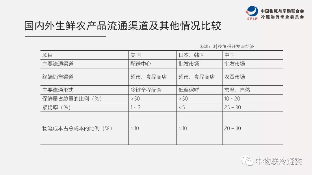 在主要的流通形式上,美國和日本基本實現了全程冷鏈,中國整個的冷鏈流通率較低,例如果蔬類的也就在10%多。再看保鮮總量的占比,以及損耗率,在發達國家損耗基本上控制 在5%以內,我們達到了25%到30%。物流成本占比方面美國和日韓成本控制在10%,國內現在生鮮電商物流成本占到了30%。
