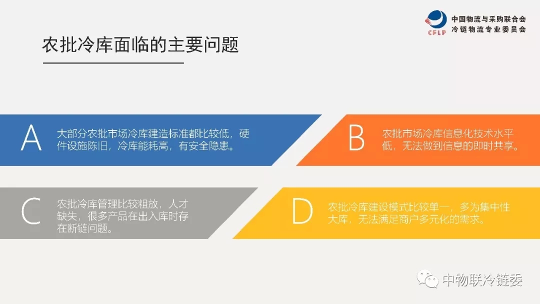 2.農批市場冷庫信息化技術水平低,無法做到信息的即時共享。現在冷庫面臨淡旺季的問題,特別是冷庫使用效率低的問題,這是本身冷庫信息化的問題,還有全國冷庫連接的問題。冷鏈委有一個鏈庫平臺,會專門解決全國冷庫共享的問題。