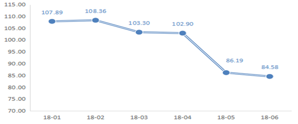 塑料托盤價格上半年整體呈下行趨勢。6月塑料托盤價格指數(shù)收報于84.58點,較1月下跌23.31個百分點,環(huán)比下跌1.6個百分點,跌幅為1.86%。如圖4-6所示,2月塑料托盤價格指數(shù)出現(xiàn)小幅上調(diào),環(huán)比上漲了0.47個百分點,自3月起,塑料托盤的價格指數(shù)持續(xù)下跌,尤其是5月,環(huán)比下跌了16.71個百分點,跌幅為16.24%,跌幅最大。塑料托盤價格持續(xù)下跌與國家的環(huán)保政策密切相關。先有蕪湖市因中央環(huán)保督查后違法率仍較高被安徽省環(huán)保廳掛牌督查,后有“藍天保衛(wèi)戰(zhàn)強化督查”將安徽省納入督查范圍,一系列環(huán)保政策使塑料托盤的價格一跌再跌,預計下跌的趨勢仍會延續(xù)。