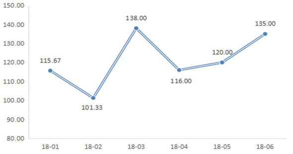 6月托盤行業(yè)景氣指數(shù)收報于135.00點,較1月上漲了19.33個百分點。如圖1-5所示,上半年托盤行業(yè)景氣指數(shù)呈現(xiàn)“W”型波動走勢,總體呈上升趨勢。其中3月達到峰值,收報于138.00點,這主要是因為春節(jié)過后企業(yè)恢復正常生產(chǎn)經(jīng)營活動,企業(yè)家們對開工后托盤行業(yè)的發(fā)展信心較足。2018年上半年的托盤行業(yè)景氣指數(shù)均位于榮枯線100以上,除2月(春節(jié)期間工廠放假,市場需求量減少,使2月的托盤行業(yè)景氣指數(shù)較低)以外,均在高景氣區(qū)間波動。