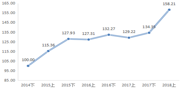 2018年上半年托盤產(chǎn)業(yè)貢獻指數(shù)收報于158.21點,較2017年下半年上漲了23.86個百分點。圖1-6顯示的是自2014年以來托盤產(chǎn)業(yè)貢獻指數(shù)的走勢,從圖中可以看出,托盤產(chǎn)業(yè)的貢獻指數(shù)整體呈上漲的態(tài)勢,雖2015年下半年至2017年下半年間貢獻指數(shù)走勢有所波動,但2018年上半年貢獻指數(shù)又呈大幅上漲態(tài)勢(托盤企業(yè)不斷引入投資,擴大生產(chǎn)規(guī)模),從側面反映出托盤產(chǎn)業(yè)處于快速發(fā)展階段,托盤產(chǎn)業(yè)對于物流產(chǎn)業(yè)的貢獻程度在逐步顯現(xiàn),預計這一增長態(tài)勢的在下半年將會延續(xù)。
