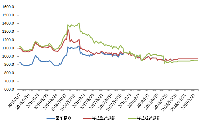 分車型看,各車型指數均小幅回落。其中,整車指數為970.06點,環比回落0.03%;零擔重貨指數為969.76點,環比回落0.04%;零擔輕貨指數為956.34點,環比回落0.03%。