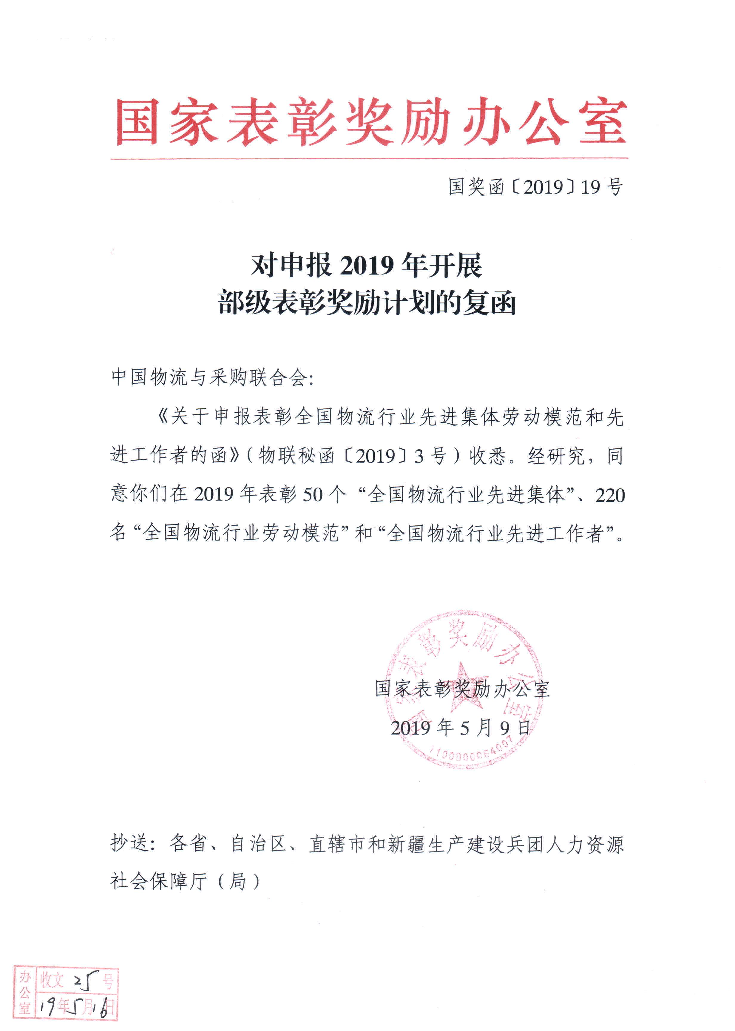 近日,國家表彰獎勵辦公室復函中國物流與采購聯合會,同意在2019年表彰50個“全國物流行業先進集體”、220名“全國物流行業勞動模范”和“全國物流行業先進工作者”。