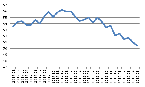 據中國物流與采購聯合會發布,2019年5月份全球制造業PMI為50.5%,較上月下降0.5個百分點,較去年同期下降4.1個百分點,連續兩個月環比下降,創出近兩年新低。分區域看,亞洲和非洲制造業PMI回調幅度較小,制造業保持平穩增長,歐洲和美洲制造業PMI回調幅度相對較大,制造業增速放緩明顯。
