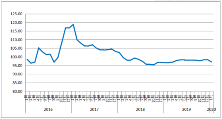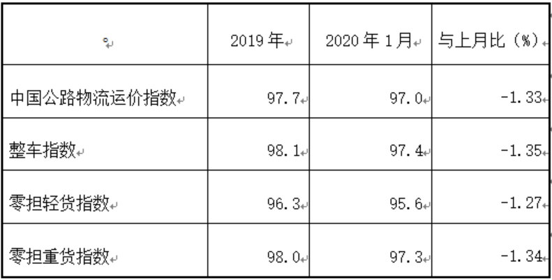 2020年1月份,由中國物流與采購聯合會和林安物流集團聯合調查的中國公路物流運價指數為97點,比上月回落1.33%,比去年同期增長0.5%。月內各周指數整體呈回落趨勢,其中第一、三、四周環比回落,第二、五周環比回升。