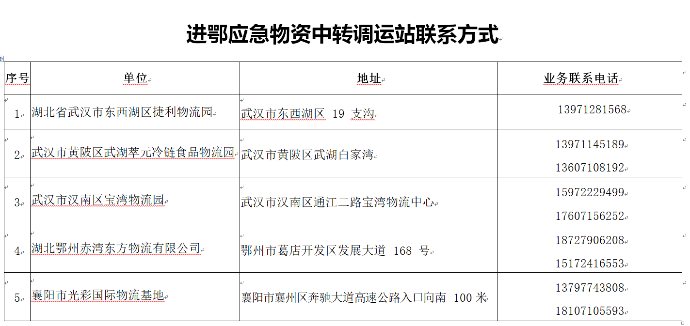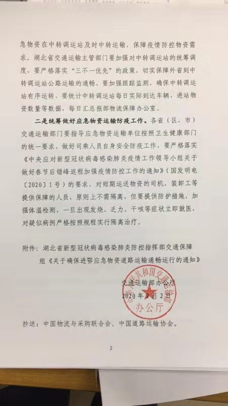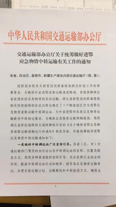 按照國務院有關新型冠狀病毒感染肺炎防控工作的部署要求,為確保外省進鄂道路運輸通道暢通,有效保障湖北省疫情防控各類物資的及時運輸,湖北省新型冠狀病毒感染肺炎防控指揮部在武漢周邊確定了5個物流園區作為進鄂應急物資道路運輸中轉調運站,為外省進鄂的各類應急物資運輸提供中轉轉運服務。為確保應急物資運輸順暢高效,現將湖北省防控指揮部交通保障組印發的《關于確保進鄂應急物資道路運輸通暢運行的通知》轉發你省,并就統籌做好進鄂應急物資中轉運輸通知如下: