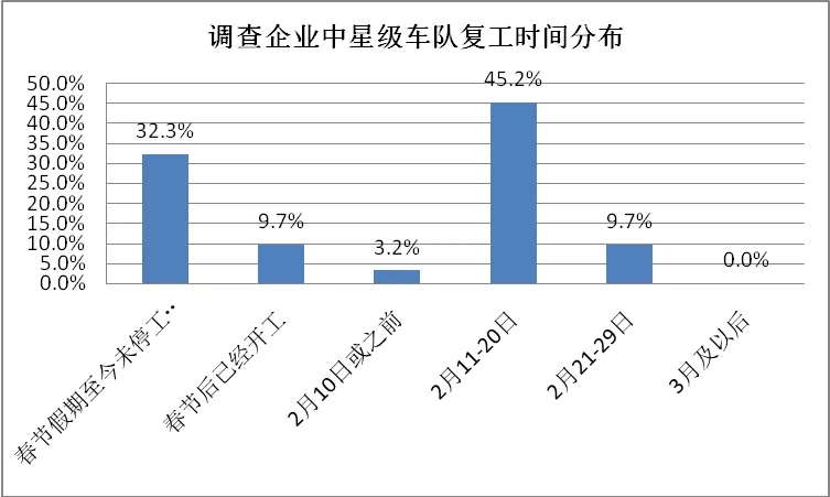 被調(diào)查企業(yè)中,85%的企業(yè)反映疫情對企業(yè)經(jīng)營造成較大影響,其中反映影響較大的占50%,部分企業(yè)經(jīng)營暫時停頓。還有7%的企業(yè)反映影響嚴重,可能出現(xiàn)破產(chǎn)倒閉風險。被調(diào)查企業(yè)中,2月10日后開工的占58%,但是據(jù)調(diào)研企業(yè)反映,企業(yè)復工復產(chǎn)形勢嚴峻,多地存在延期復工問題。星級車隊復工情況好于行業(yè)平均水平,有32.3%的車隊春節(jié)至今未停工停產(chǎn)。