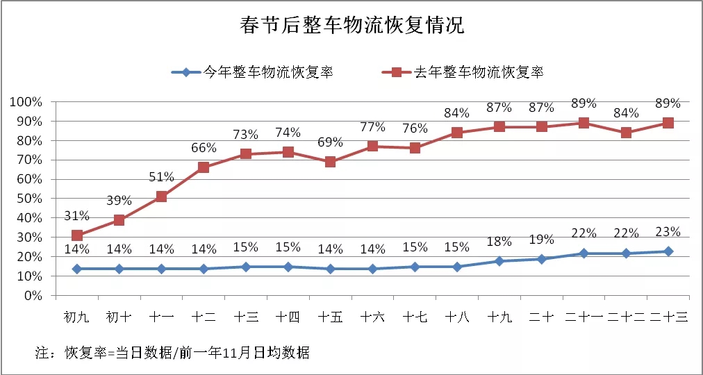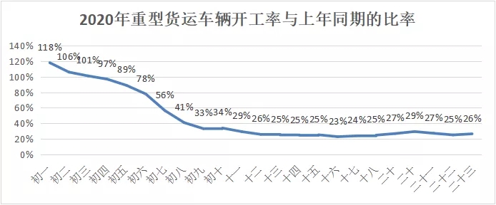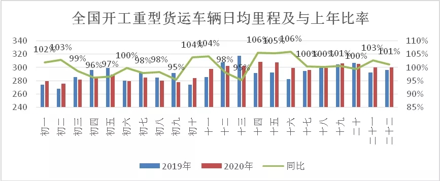 行業(yè)大數(shù)據(jù)顯示,行業(yè)車輛開工率大幅低于往年。據(jù)全國道路貨運車輛公共監(jiān)管與服務(wù)平臺數(shù)據(jù)分析顯示,全國貨運車輛節(jié)后開工形勢不佳,正月十五(2月8日)全國12噸以上重型貨運車輛開工率僅為往年同期的四分之一。正月十七(2月10)以后,隨著企業(yè)加快復工復產(chǎn),行業(yè)開工率小幅回升,接近往年的三成左右。開工車輛運行效率穩(wěn)定,數(shù)據(jù)顯示,節(jié)后全國開工重型貨運車輛日均行駛里程與上年基本持平,反映已開工車輛運行效率基本穩(wěn)定。