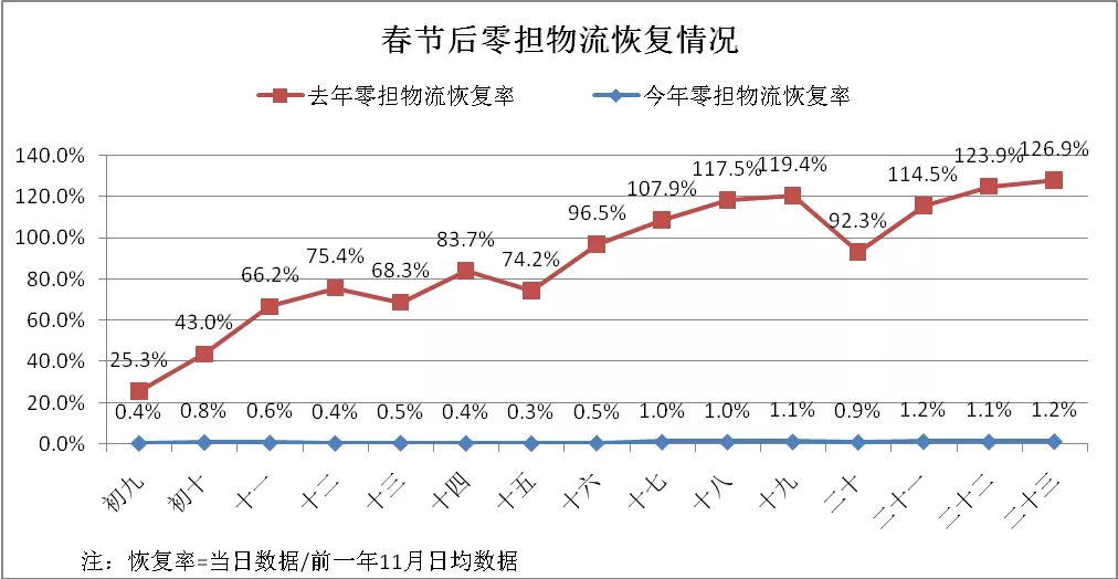 從細分市場看,快遞包裹運輸恢復較為穩(wěn)定。整車運輸大量為合同運輸、快遞外協(xié)以及大宗商品運輸,G7平臺大數(shù)據(jù)顯示,受其他行業(yè)復工復產(chǎn)進度影響,整車運輸車輛恢復率為往年的四分之一。零擔運輸整體恢復率不到往年的5%,除部分規(guī)模型零擔快運企業(yè)外,大部分零擔貨運市場和中小零擔專線企業(yè)受各種因素影響還沒有開門營業(yè)。由于零擔貨運市場沒有開門,為大量中小制造商貿(mào)企業(yè)提供業(yè)務(wù)配套和小批量運輸?shù)牧銚鷺I(yè)務(wù)無法開展,部分企業(yè)為保障生產(chǎn)不得不采取價格更高的包車運輸,大大提高了社會物流成本。