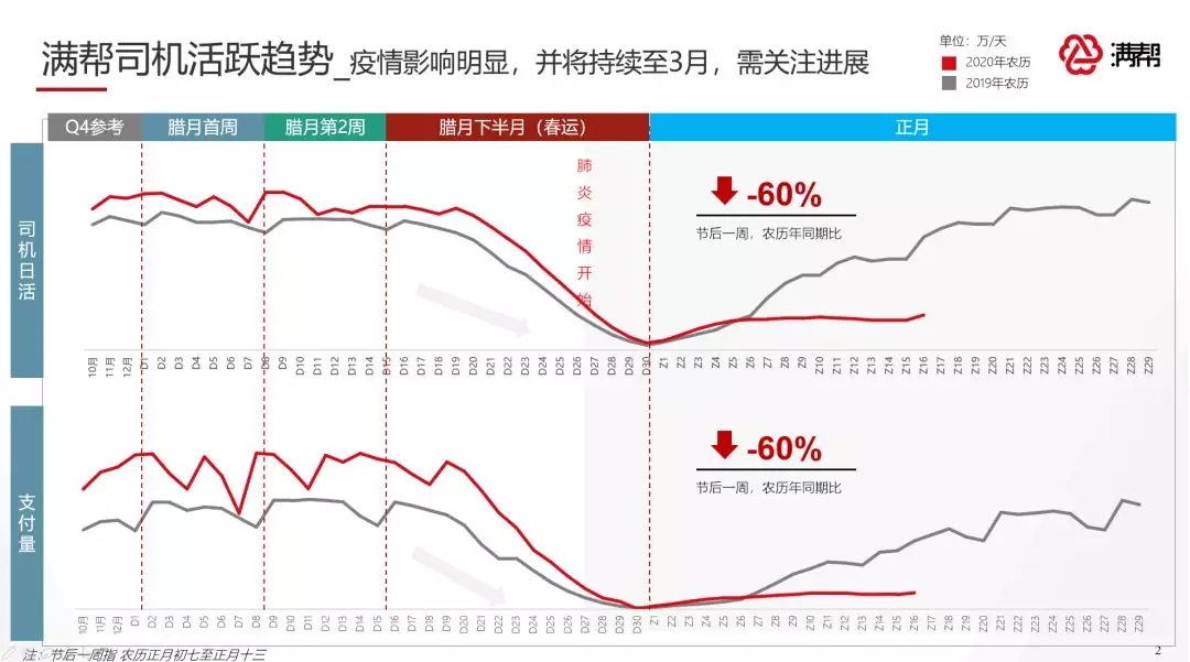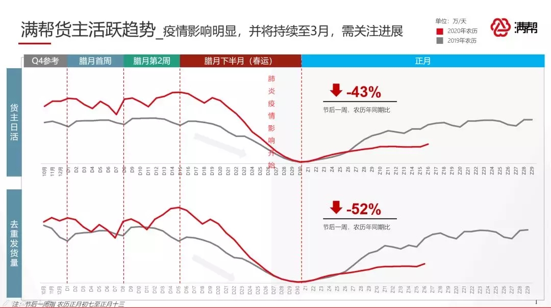 貨運物流平臺受影響明顯。據(jù)滿幫平臺數(shù)據(jù)顯示,節(jié)后一周,貨主端和司機端平臺業(yè)務(wù)分別較上年下降52%和60%,網(wǎng)絡(luò)貨運業(yè)務(wù)成交量和訂單量僅為去年同期的10%-20%,反映中小貨主和個體司機受疫情影響較大。