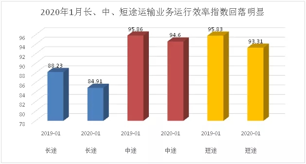 【長、中、短途月指數】1月份,長途月指數為84.91;中途的月指數為94.6,;短途的月指數為93.31。受疫情影響,與19年一月份相比,長途、中途、短途月指數均呈現明顯幅度的下降。