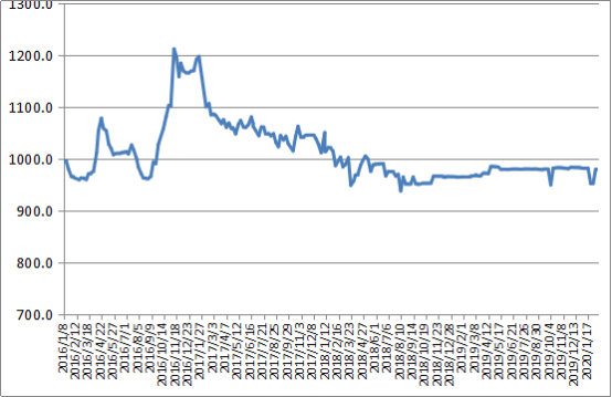圖1 2016-2020年各周中國(guó)公路物流運(yùn)價(jià)指數(shù)