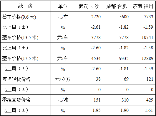 分車型看,各車型指數(shù)漲跌不一。其中,整車指數(shù)為983.76點(diǎn),比上周回落0.04%;零擔(dān)重貨指數(shù)為983.39點(diǎn),比上周回落0.03%;零擔(dān)輕貨指數(shù)為964.03點(diǎn),比上周回升0.01%。