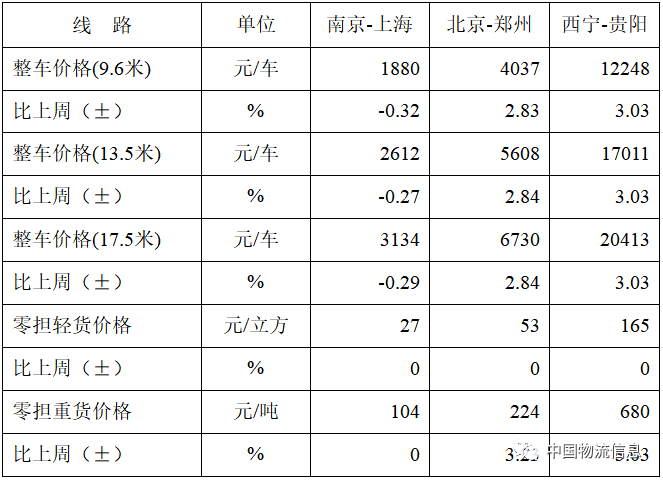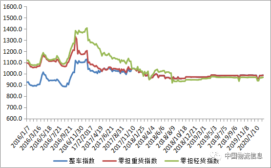 分車型看,各車型指數略微回升。其中,整車指數為987.69點,比上周回升0.10%;零擔重貨指數為986.88點,比上周回升0.10%;零擔輕貨指數為968.07點,比上周回升0.01%。
