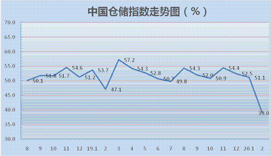 中國(guó)物流與采購(gòu)聯(lián)合會(huì)與中儲(chǔ)發(fā)展股份有限公司聯(lián)合調(diào)查的2020年2月份為39.0%,較上月回落12.1個(gè)百分點(diǎn)。各分項(xiàng)指數(shù)中,期末庫(kù)存指數(shù)較上月有所回升,其余指數(shù)均有明顯回落。