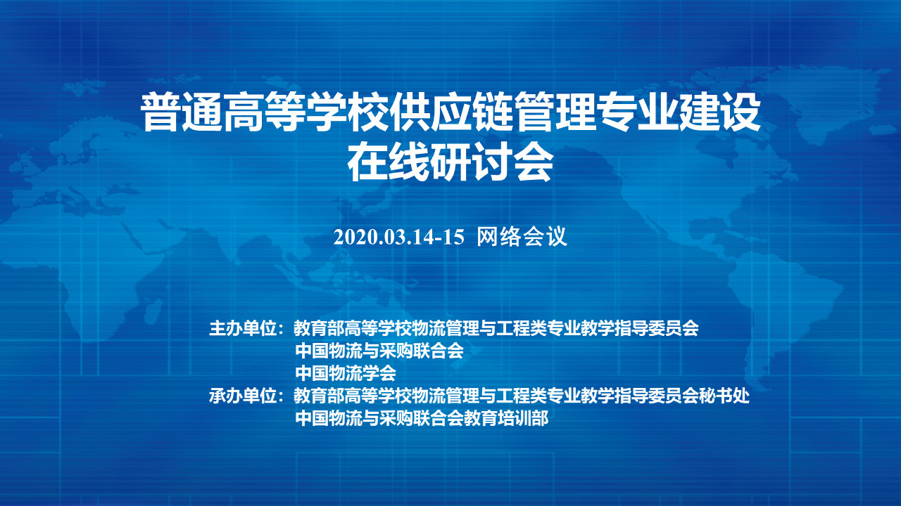 為解決供應(yīng)鏈管理本科專業(yè)建設(shè)面臨新機遇和挑戰(zhàn),扎實做好供應(yīng)鏈管理專業(yè)建設(shè)工作,2020年3月14-15日,由教育部高等學(xué)校物流管理與工程類專業(yè)教學(xué)指導(dǎo)委員會(以下簡稱物流教指委)、中國物流與采購聯(lián)合會、中國物流學(xué)會聯(lián)合發(fā)起的“供應(yīng)鏈管理專業(yè)建設(shè)在線研討會”通過網(wǎng)絡(luò)在線方式召開。