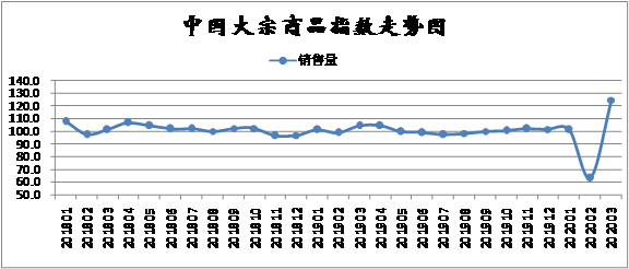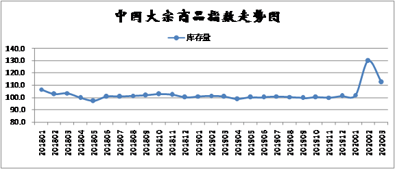 2020年3月份,大宗商品銷售指數觸底回升,至124.9%,顯示隨著我國疫情基本得到控制,各地陸續復產復工,帶動了國內需求增加,加之政府不斷出臺多項措施幫助企業復工以及穩定就業,市場情緒明顯好轉,也提振了市場的補庫需求,本月國內大宗商品市場成交較為活躍,銷售情況和前期相比出現明顯回升。