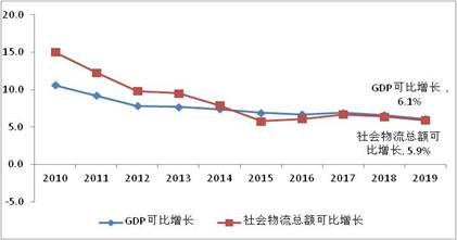 2010-2019年社會物流總額與GDP可比增長對比(單位:%)