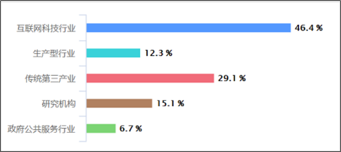 本次調研的對象涵蓋了數字化供應鏈環節的大部分企業,其中互聯網科技行業占比46.4%,生產型行業占比12.3%,傳統第三產業占比29.1%,研究機構占比15.1%,政府公共服務行業6.7%。