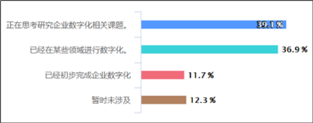 企業數字化是分階段進行,總體看來,超過87.7%的企業都已經開始數字化轉型。調查顯示,已經在某些領域完成數字化的企業占比36.9%,初步完成數字化的企業占比11.7%。沒有考慮和正在考慮和研究數字化轉型的企業占比51.4%。(見圖 2)