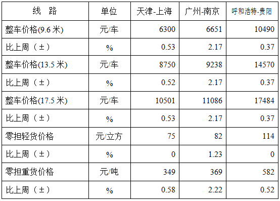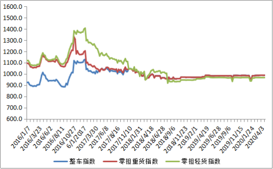分車型看,各車型指數環比有所回升。其中,整車指數為989.59點,比上周回升0.13%;零擔重貨指數為989.88點,比上周回升0.19%;零擔輕貨指數為967.63點,與上周持平。