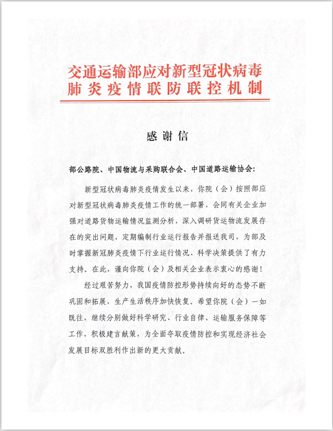 近日,交通運輸部向中國物流與采購聯合會發來感謝信,對我會在新型冠狀病毒疫情期間所做的物流行業調研等工作表示感謝。